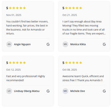 Leading Bay Area Moving means delivering exceptional service to every customer we serve. I genuinely love helping families and businesses transition to their new spaces, and I'm thankful each day for doing work that matters. My family depends on this business, which drives me to maintain the highest standards in everything we do.